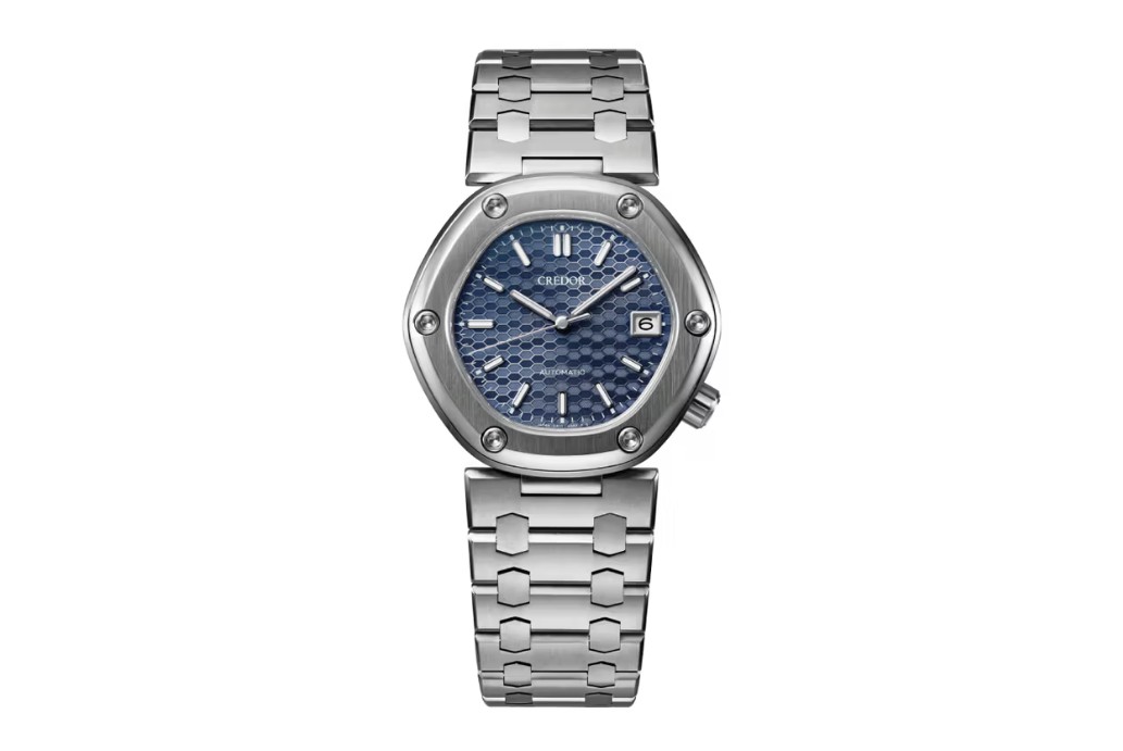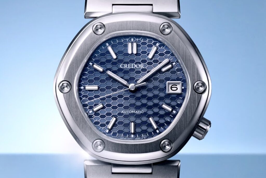 Inspired by Gérald Genta’s original 1970s design, the new Locomotive continues Credor’s dalliance with modernity. The name itself serves as a metaphor for a “driving force,” symbolizing the friendship between Genta and Seiko and their shared vision for the future. This latest iteration features a “dawn blue” dial inspired by train signal lights, decorated with an intricate geometric pattern of hexagons. Each hexagon contains striped patterns that alternate directions, causing the dial to shimmer and shift colour as it catches the light.