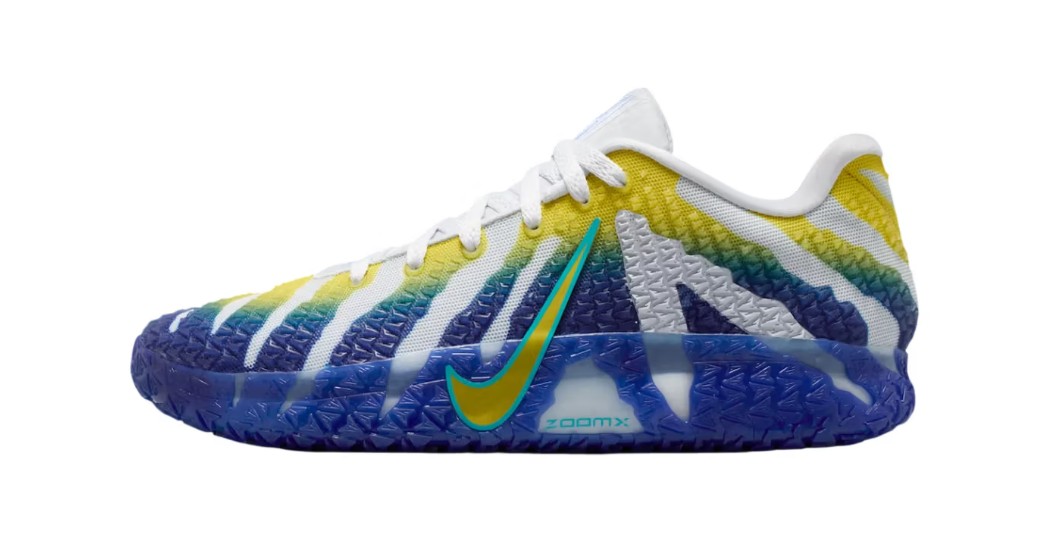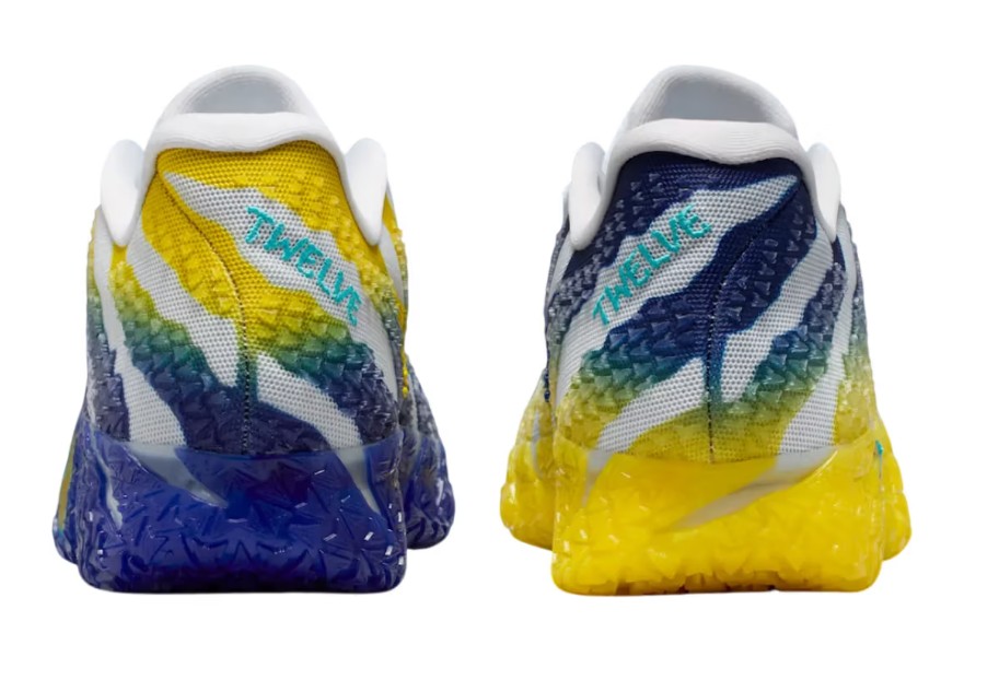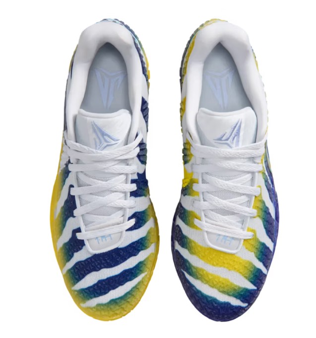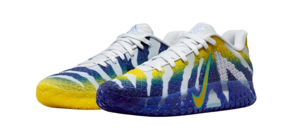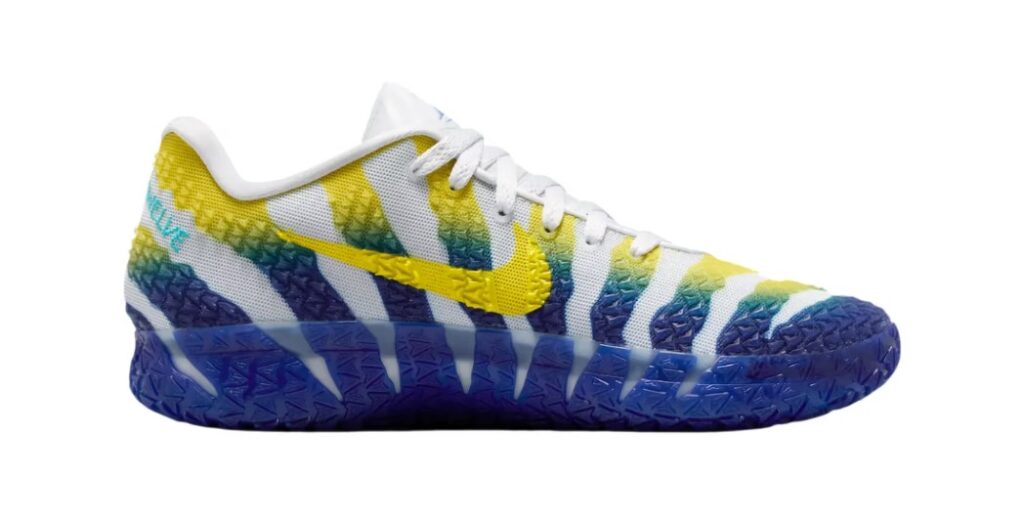 The trainer features a breathable white mesh upper with reinforced tactile overlays that shift from yellow to blue on the left shoe, and from blue to yellow on the right, echoing Murray State’s school colours. Each shoe is finished with a colour-matched rubber outsole, creating a striking pattern that highlights the Racer-inspired theme. Branding details include Ja’s signature elements across the tongue and heel, while the low-top silhouette emphasizes speed and agility.