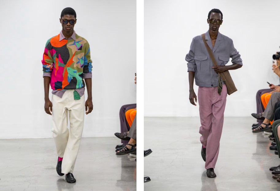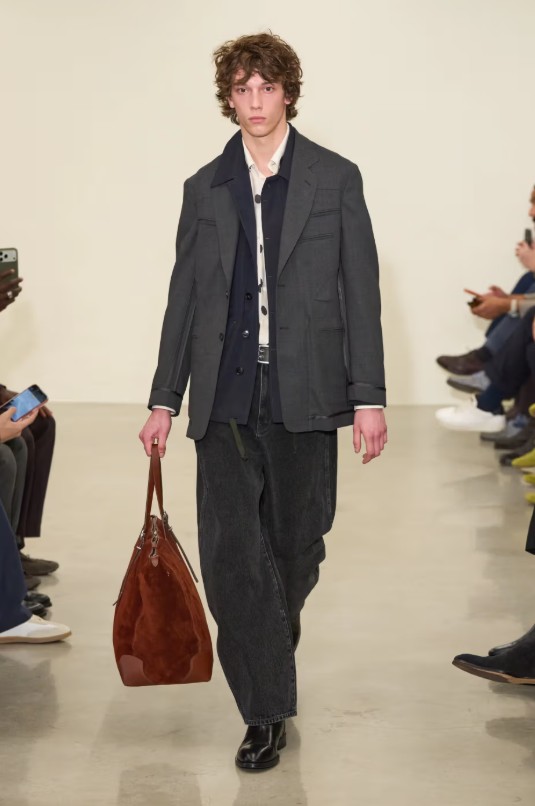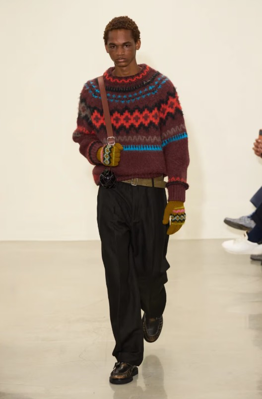 Knitwear offered a playful disruption, with archive Fair Isle designs reimagined in soft wool alpaca and styled as oversized scarves. Accessories followed suit, featuring 1980s-inspired tie patterns and handsome suede satchel-totes revived from the same decade. There is something for everyone in the new collection.