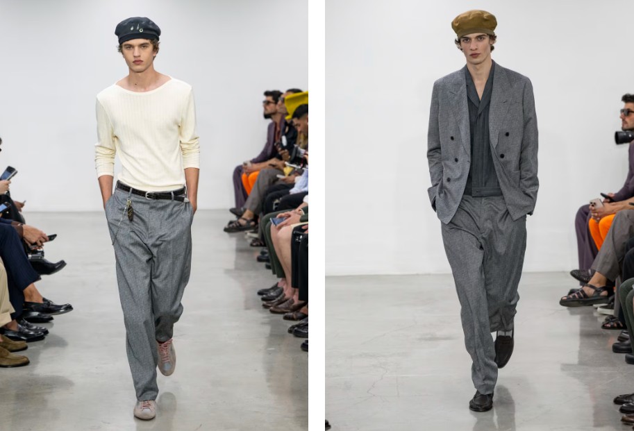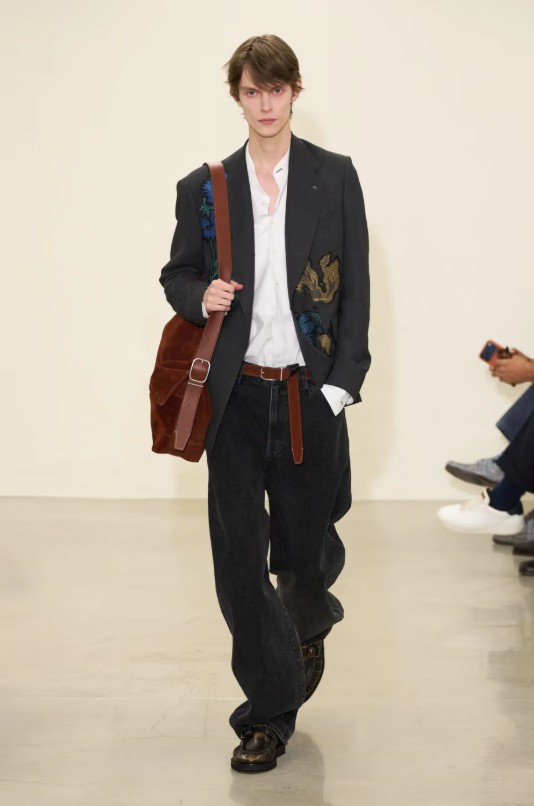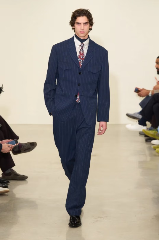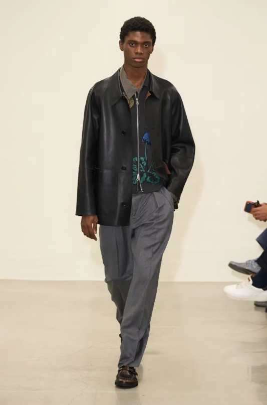 Artistic storytelling also took centre stage with shirts featuring sketches by Colin Barnes, a nod to a 1978 show where Smith utilised the artist’s drawings in lieu of runway photography. The tailoring remained sophisticated yet relaxed, featuring languid double-breasted jackets with low waistlines and pleated trousers, often paired with bib shirts for a look that balances formality with contemporary ease.